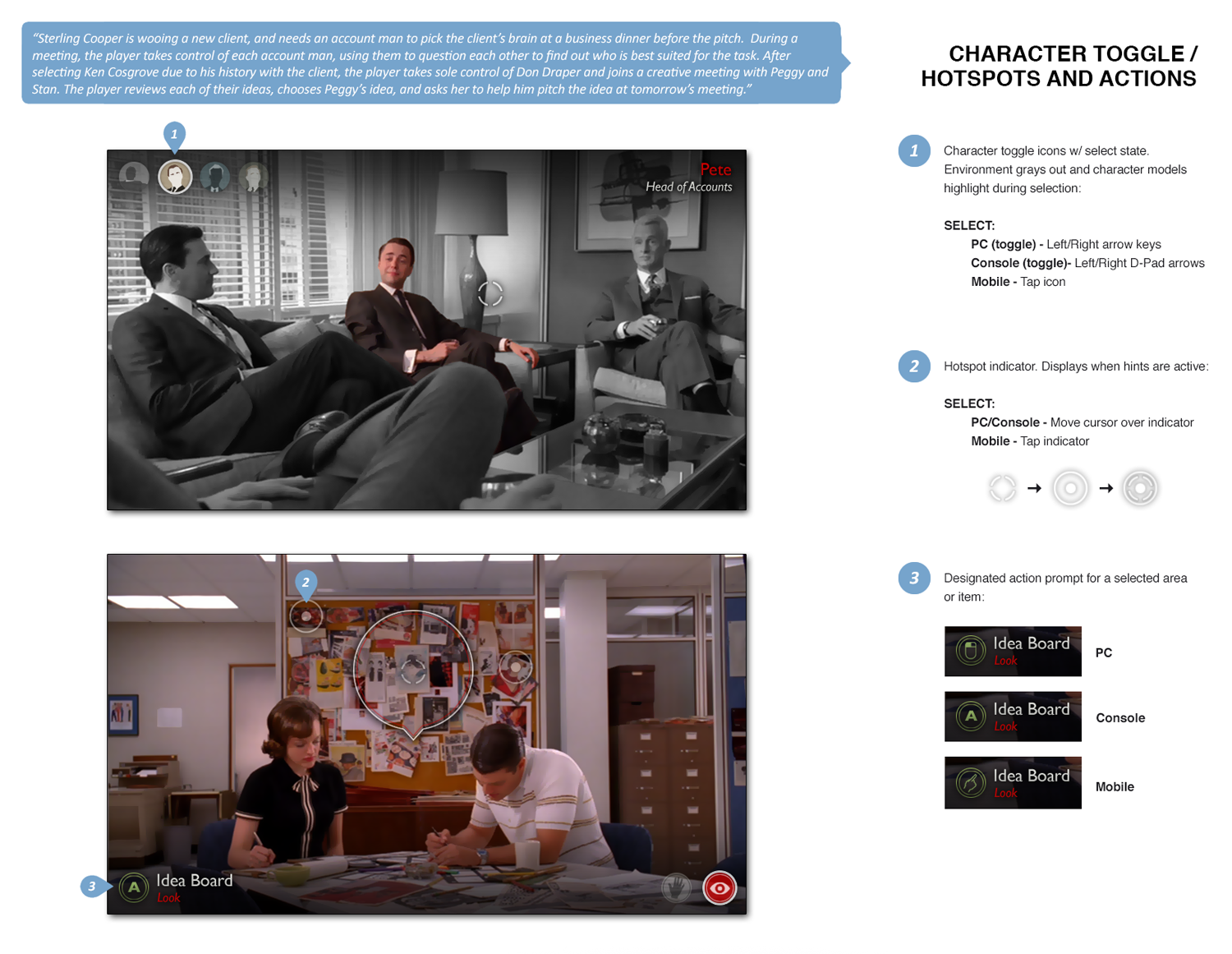 Design goals for this concept focused on creating adaptable cross-platform conventions and crafting a narrative gameplay system that would fit the IP.